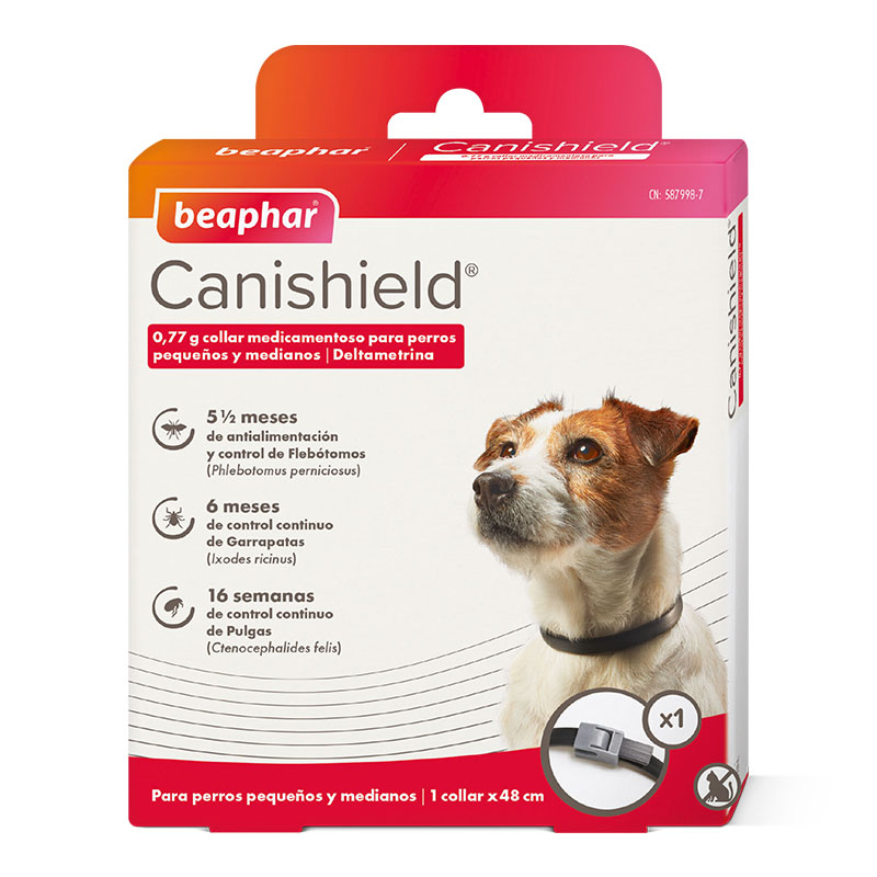 Ayuda a prevenir la leishamaniosis protegiendo de forma persistente contra flebótomos (5 meses), garrapatas (6 meses) y pulgas (16 semanas).